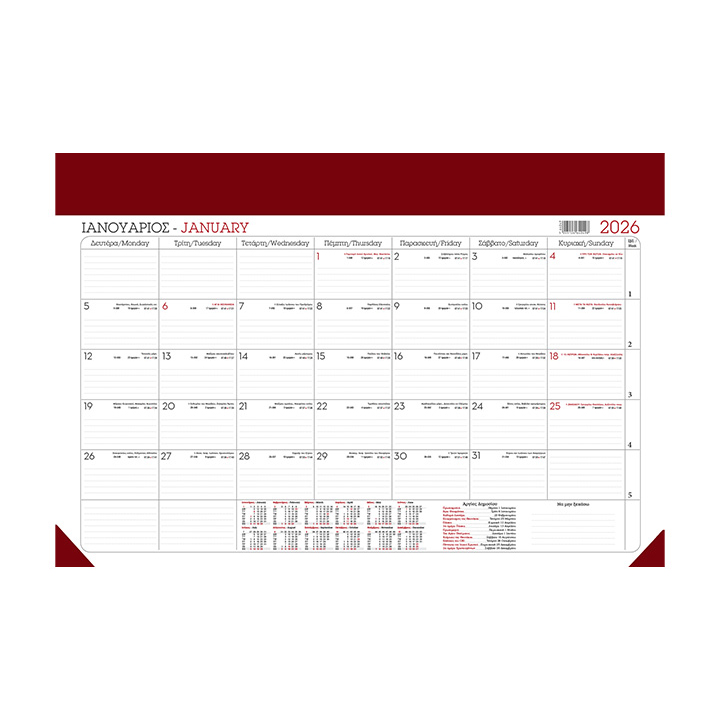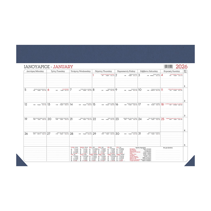 Μηνιαίο Πλάνο διαστάσεων 35x50cm. Με περφορέ για εύκολη κοπή των φύλλων. Mε χώρο για σημειώσεις ανά ημέρα. Χρωματιστή φάσα και γωνίες για εκτύπωση λογοτύπου. Διαθέσιμο σε 3 χρώματα. **Η δυνατότητα επιλογής χρώματος εξαρτάται από την διαθεσιμότητα του είδους κατά την χρονική στιγμή της παραγγελίας.