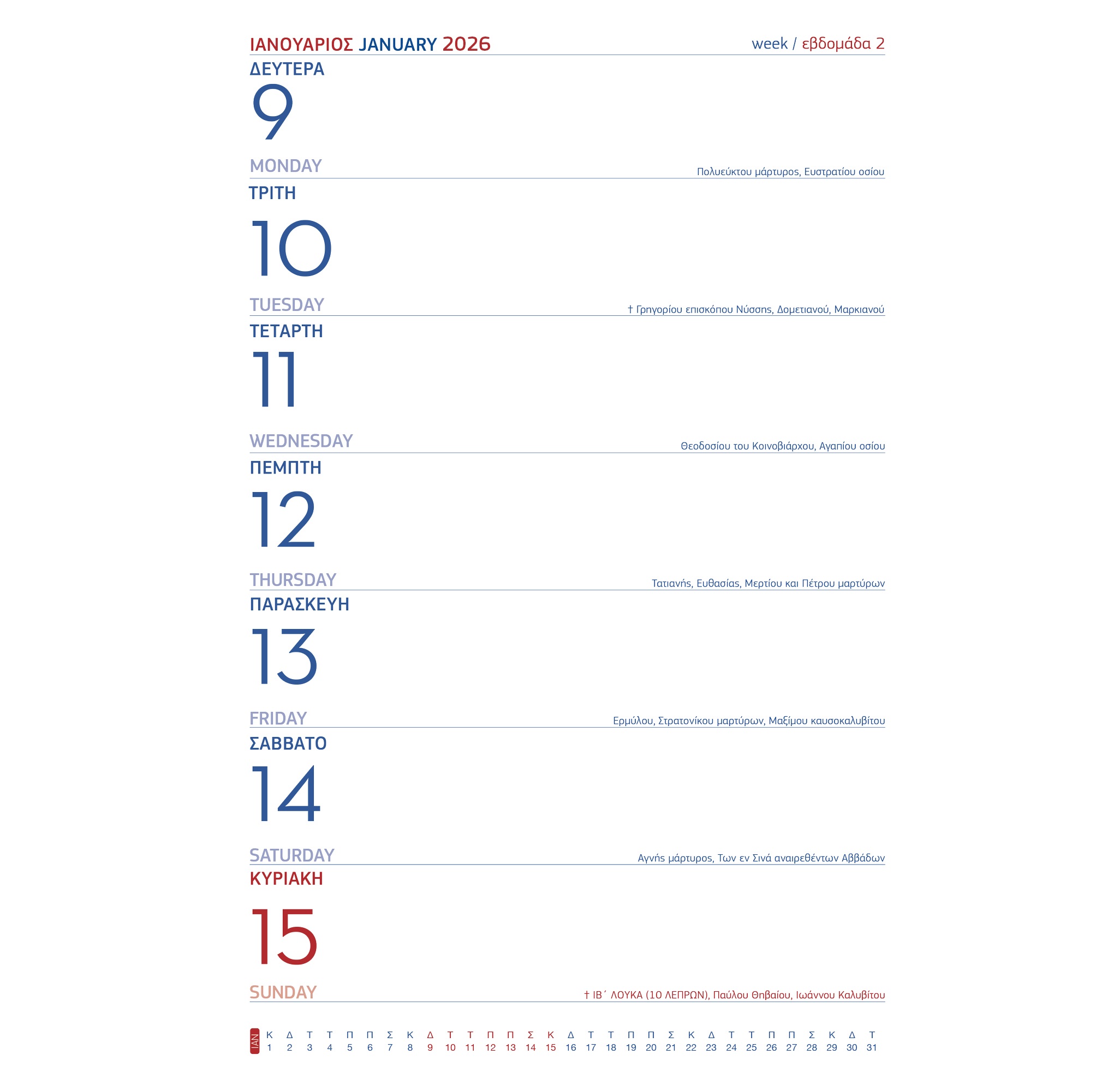 Σπιράλ εβδομαδιαίο ημερολόγιο ενός έτους με planner για την επόμενη χρονιά. Τετράχρωμη εκτύπωση στο κάλυμα και glossy πλαστικοποίηση για μεγαλύτερη αντοχή. Δίχρωμη εκτύπωση στο εσωτερικό, σε χαρτί 70 γρ. Η εβδομάδα σε μία σελίδα. Συνοπτικά ημερολόγια και πλάνα.Παγκόσμιες ημέρες, εορτολόγιο, επίσημες αργίες.Χρήσιμες πληροφορίες, τηλεφωνικό ευρετήριο. Διάσταη 17Χ24cm. Διαθέσιμο σε 8 χρώματα**Η δυνατότητα επιλογής χρώματος εξαρτάται από την διαθεσιμότητα του είδους κατά την χρονική στιγμή της παραγγελίας.